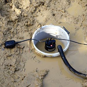 Du kan aktivere tilkoblingen enten med en bryter i skuret eller huset (avhengig av hvor du har lagt kabelen) eller med en flottørbryter (vist på bildet). Flottørbryteren aktiveres når vannivået stiger og flytter bryteren i vertikal stilling, noe som starter pumpen.