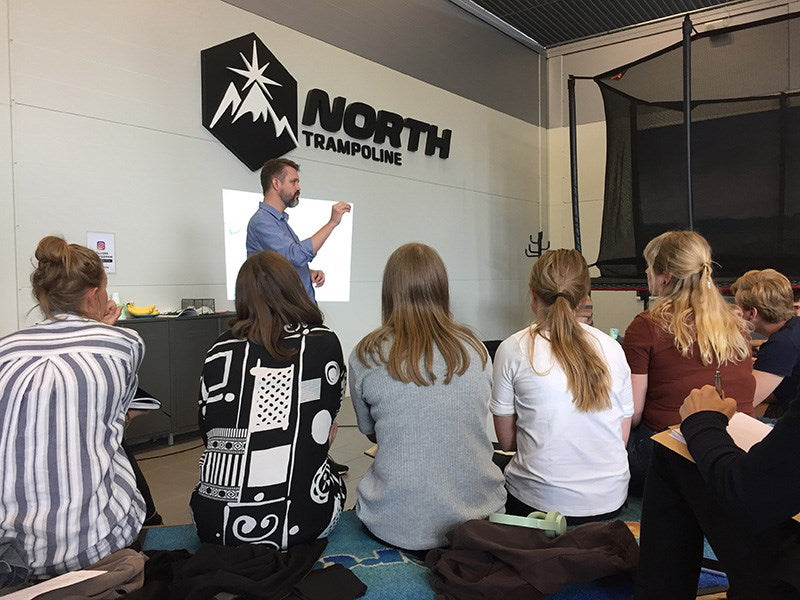 Thomas Hagel, FoU-sjef ved North Trampoline, snakker om produksjonsmetoder og materialer med studentene ved Industridesignprogrammet, Gävle Universitet.
