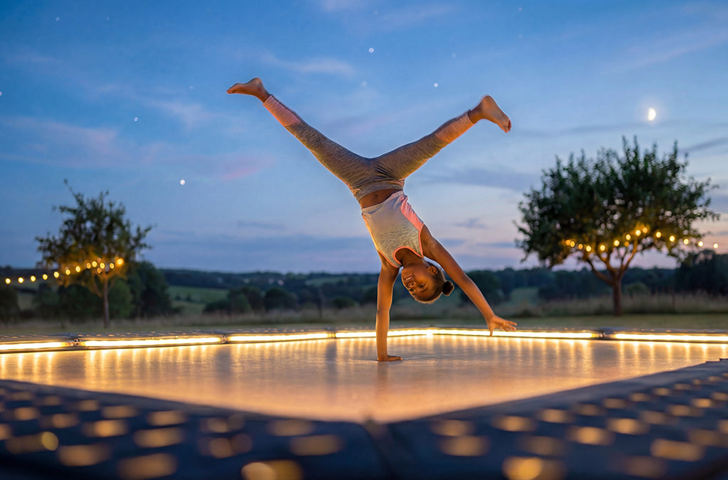 La barna hoppe langt utover kvelden og skap et fantastisk blikkfang i hagen med vårt nye fargeskiftende LED-lyssystem for nedgravd trampoline.